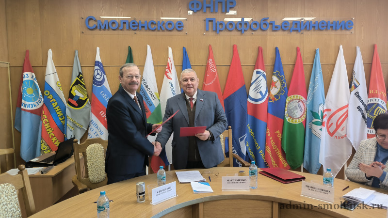 Уполномоченный по правам человека в Смоленской области Геннадий Сенченков и Председатель Союза «Смоленского областного объединения организаций профсоюзов» Евгений Максименко подписали соглашение о сотрудничестве по вопросам соблюдения и восстановления социально – трудовых прав и иных законных интересов работников на территории Смоленской области.